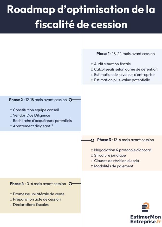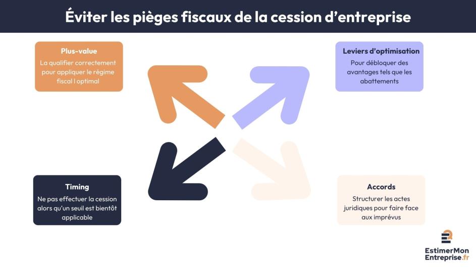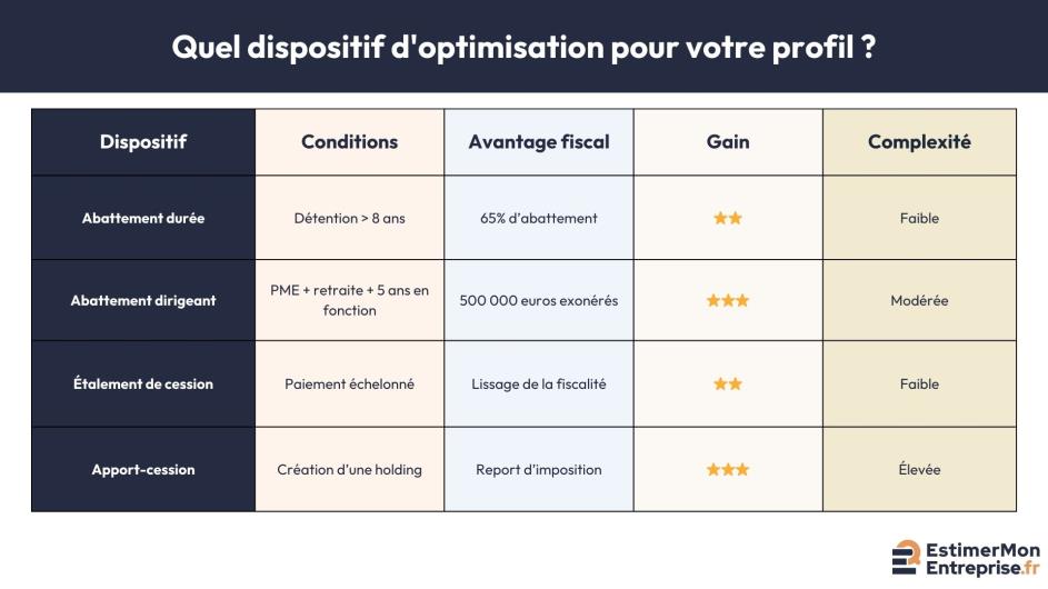 Notez aussi que l'optimisation fiscale de la cession peut, selon votre situation personnelle et patrimoniale, vous faire réaliser des économies substantielles. Différents régimes peuvent s'appliquer : plus-values professionnelles, abattements pour durée de détention, exonérations sous conditions.