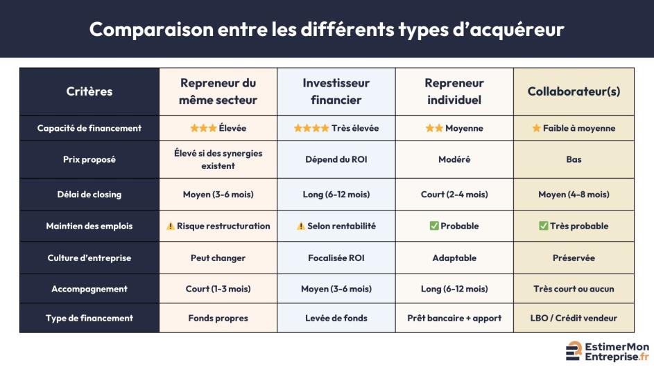 Le bon acquéreur n'est pas forcément celui qui offre le prix le plus élevé. Chaque type de repreneur présente des avantages et des inconvénients qu'il faut analyser au travers du prisme de vos priorités.